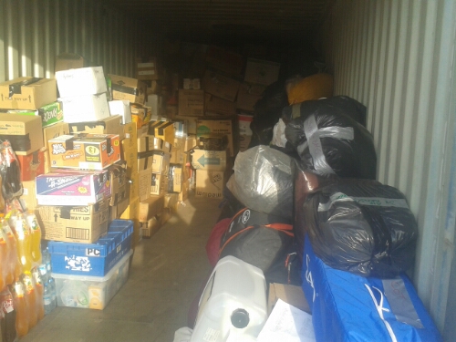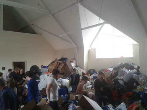 Mountains of stuff, donated, collected, waiting to be sorted; people busying and organised community spirit.