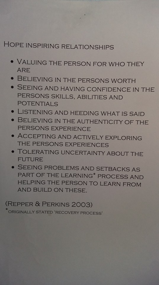 All our Youth work & Ministry is about the business of transforming, and to do this we need to inspire young people to Hope, to Dream and to seize possibilities. So, from the streets, to the cafes, to the groups, as youthworkers we dont take lightly the privilege of spending time, and building a positive relationship with a young person. We are probably inspiring hope without realising it. If developing Hopeful relationships is what is needed within mental health recovery, then it is worth developing within core youthwork practice too.